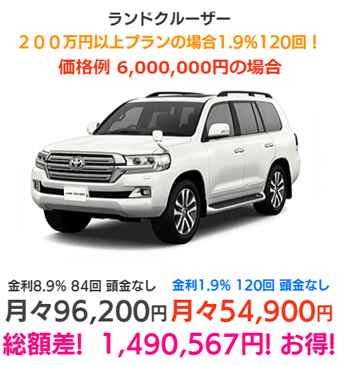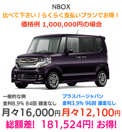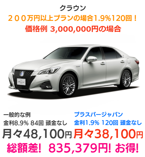 色々な大手の中古車屋をまわりましたが、金利が高い!!そこで、ネットで【低金利】を検索したらプラスパージャパンさんが出てきたので、