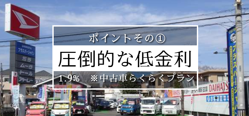中古車ご購入金利も1.9%~最長120回と中古車でも地域最低金利にチャレンジしており、大変お買い求め易くなっております。